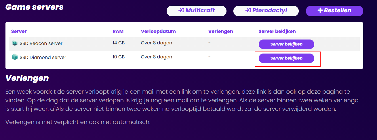 Als je hierop hebt geklikt kom je op de volgende pagina, hier kun je alle game servers zien die jij bij ons host. Kies de server die jij wilt upgraden en klik vervolgens bij die server op "Server bekijken". In dit geval gaan we mijn SSD Diamond server upgraden.